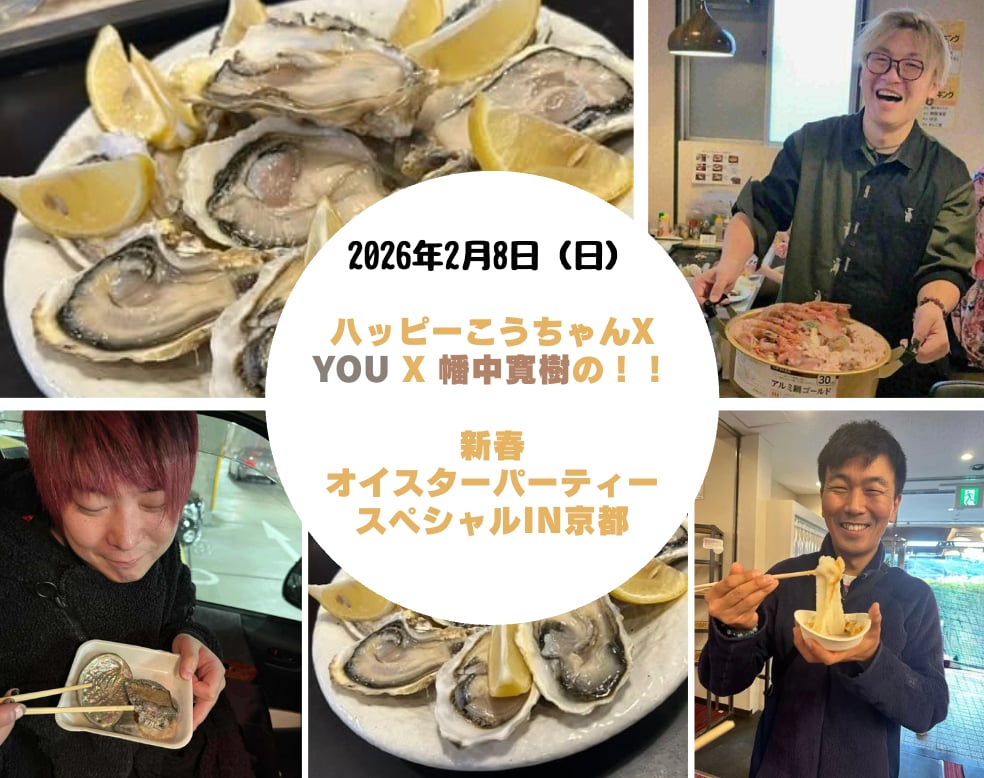 ハッピーこうちゃん、YOU、幡中寛樹の3人と過ごす豪華新年会オイスターパーティー美味しい牡蠣鍋を囲みながらハッピーこうちゃんの愉快なトークとYOU &幡中寛樹によるスペシャルライブの時間はいかがでしょうか?みんなで弥栄しましょうぞー!!!!